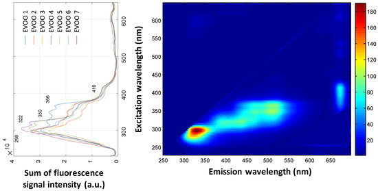 Three-dimensional front-face fluorescence spectroscopy. Left: Excitation spectra of seven extra virgin olive oil (EVOO) samples (wavelengths at local maxima are indicated). Right: example of three-dimensional front-face fluorescence spectra obtained from EVOO l sample. Excitation spectra are obtained as the sum of the emission intensity signals along the x axis from 250 to 698.5 nm.