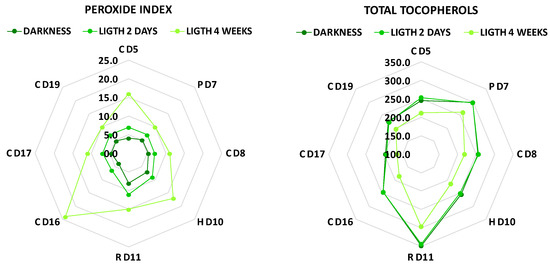 Radial diagrams in Figure 3 illustrate the evolution of the peroxide index and the total tocopherols content during light exposure. Each spoke of the polygon corresponds to an initial sample. Peroxide index increased with light exposure, as expected, since the appearance of peroxides is a result of oxidation processes. In contrast, the content of total tocopherols decreased as a consequence of their antioxidant activity.