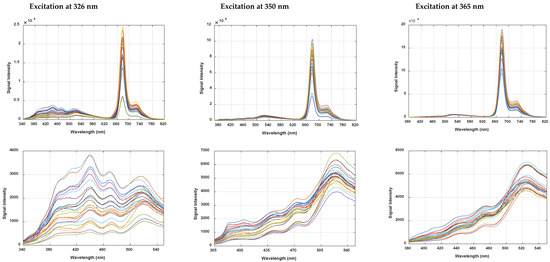 Fluorescence emission spectra. Upper row: fluorescence emission spectra (N = 24 samples) obtained at excitation wavelengths centered at 326, 350 and 365 nm. Bottom row: detailed emission between 340 nm and 550 nm.