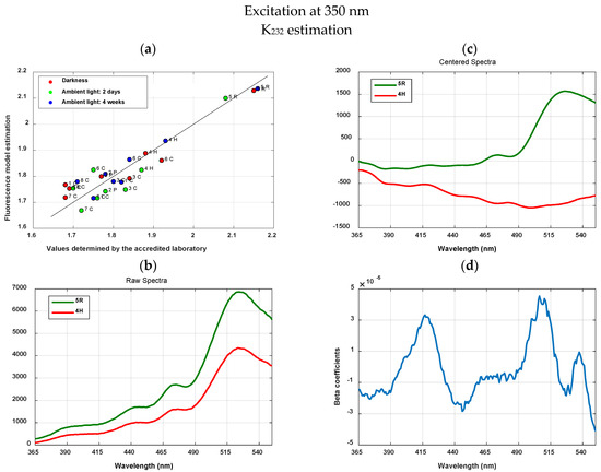 (PLSR) with 4 latent variables for estimation of K232 with excitation at 350 nm. (a) K232 values determined by the accredited laboratory versus the values estimated with the fluorescence models (colors refer to the three illumination conditions); (b) spectra of 5R (green circle) and 4H (red circle) of high and low values of K232 respectively; (c) the two spectra centered with respect to the average of the whole sampling group (N = 24); (d) beta coefficients of the estimation model.