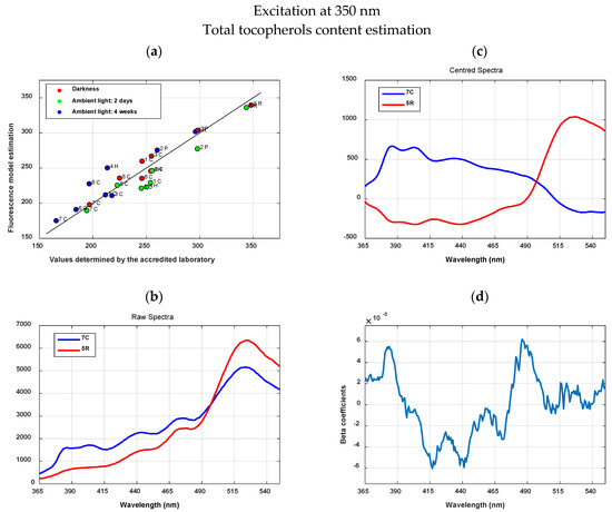 PLSR with 4 latent variables for estimation of total tocopherols content with excitation at 350 nm. (a) Total tocopherols values determined by the accredited laboratory versus the values estimated with the fluorescence models (colors refer to the three illumination conditions); (b) Spectra of 5R (red circle) and 7C (red circle) of high and low total tocopherols content respectively; (c) the two spectra centered with respect to the average of the whole sampling group (N = 24); (d) beta coefficients of the estimation model.