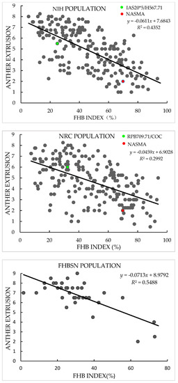 Scatter plots of Fusarium head blight (FHB) index against anther extrusion in “NASMA” × “IAS20*5/H567.71” (NIH), “NASMA” × “RPB709.71/COC” (NRC), 16th Fusarium head blight screening nursery (FHBSN), and “Panel of Parents” (POP) populations, using overall means. The red dot represents NASMA, and the green dot represents IAS20*5/H567.71 or RPB709.71/COC. The correlations are all significant at p < 0.0001.