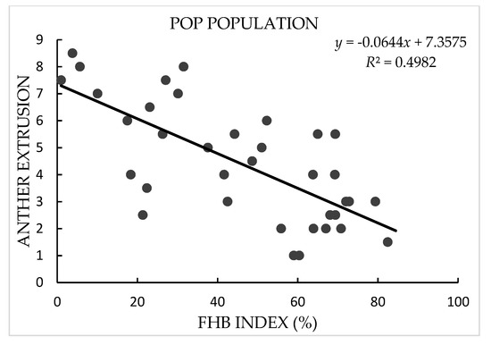 A wide range of variation for AE among wheat genotypes was reported in recent studies. This trait was extensively studied as a factor promoting cross-pollination in hybrid breeding [7,8,15,29], and it showed a close relationship with FHB resistance in wheat [4,5,9,11,30]. It is generally acknowledged that cleistogamy and high AE have better Type I resistance against FHB [11]. This is in agreement with the results from the present study, where AE was consistently correlated with field FHB resistance.