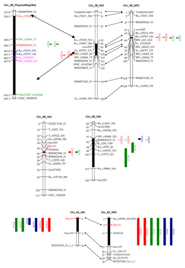 QTL for FHB resistance, anther extrusion (AE), plant height (PH), and days to heading (DH) on chromosomes 3B, 4B, 4D, 5A, and 5B in the “NASMA” × “IAS20*5/H567.71” (NIH) and “NASMA” × “RPB709.71/COC” (NRC) populations using the multiple QTL mapping (MQM) method. Genetic distances are shown in centimorgans to the inner or left side of the linkage groups, whereas QTL ranges are denoted to the outer or right side of the linkage groups. Only framework markers are presented except for the QTL regions.