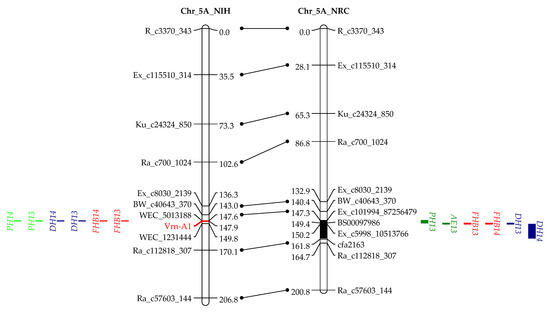 In addition to the two dwarfing genes that showed association with multiple traits, we also detected two QTL on 5AL and 5BL, which were associated with AE, DH, and FHB (Table 2 and Table 3, Figure 2). The QTL on 5AL encompasses Vrn-A1, spanning a region between 585.1 and 587.4 Mb in the Chinese spring (CS) reference genome. Recently, Muqaddasi et al. [8] reported a QTL on 5AL for AE, and its physical position was about 592.0 Mb, very close to ours and, thus, likely to be the same QTL. The QTL on 5BL responsible for AE, DH, and FHB spans a physical region between 583.6 and 613 Mb in the CS genome, closely linking to the Vrn-B1, with a distance of only 9.5 Mb. It could be possible that Vrn-A1 and Vrn-B1 are the underlying genes for these two QTL, and they affected FHB by regulating AE and DH.