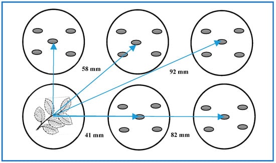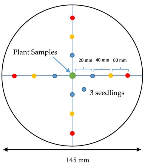 The layout of the single petri dish (SPD) method: the control level of growth of the L. sativa seedling by volatile allelochemicals in the glass petri dish desk. Different coloured dots represent the various distances (20 mm, 40 mm, and 60 mm) and directions of the tested L. sativa seeds.