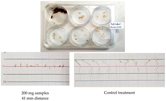 At a distance of 82 mm and 72 h time duration, the radicle growth controlled by 5 mg, 25 mg, 50 mg, 100 mg, and 200 mg were −8.63%, 5.26%, 11.1%, 32.9%, and 32.1%, respectively (Figure 7c). The results indicate that the released strong volatile allelochemicals had a significant effect, even at an increased distance from the source of the donor. In contrast, a distance of 92 mm and 72 h time consideration exhibited controlled growth of the radicle by 5 mg (0.156%), 25 mg (6.08%), 50 mg (9.38%), 100 mg (9.90%), 200 mg (8.46%) (Figure 7d). The percentage of L. sativa seedling growth inhibition expressed the interaction of volatile allelochemicals, which decreased with distance. Based on this concept, test plants close to the source of volatile emissions showed a high suppression effect. The result showed that the highest inhibitory activity was detected at 41 mm distance and 72 h after incubation of the L. sativa seedling.