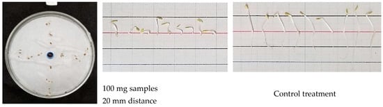 The variation of the time and the amount of dried pericarp of S. mukorossi was used to evaluate the inhibition of L. sativa seedlings elongation. The highest application rate was considered as 200 mg, followed by 100 mg, 50 mg, 25 mg, and 5 mg. By estimation, the EC50 (Effective Concentration that induces half-maximal inhibitory activity) of the pericarp of S. mukorossi, due to the volatile emission, was 22.6 mg/dish, with 41 mm distance and 72 h time consideration (Figure 6). Octyl acetate, the identified volatile allelochemical from Heracleum sosnowskyi fruit, slightly suppressed the radicle and hypocotyl elongation of L. sativa seedlings at EC50 values of 64 and 57 ng/cm3, respectively [].