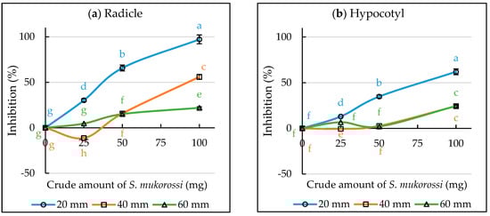 Single petri dish method evaluation. (a) Radicle inhibition (b) Hypocotyl inhibition. Distance consideration (20 mm, 40 mm, 60 mm), amount variation of S. mukorossi dry samples (100 mg, 50 mg, 25 mg), and correlation investigated control level of the growth variable of the (a) radicle and (b) hypocotyl of L. sativa seedlings. The data compared by Tukey’s HSD test and values are the average of three replications of (±) standard error.