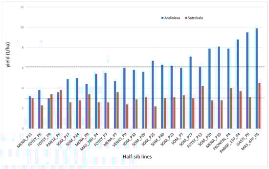 Half-sib progeny yields comparison in the two cultivation areas. Yields were calculated as plants plot yields and then referred to hectare. Dotted line represents the mean yield values obtained in Satrokala while the dashed lines the values of Andiolava.