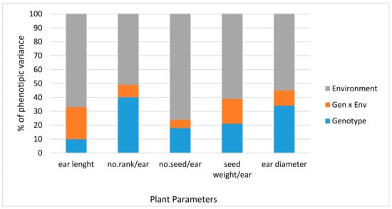 For the REML results, the partition of phenotypic variance into genetic, environmental, and G × E interaction variance (Figure 2) underlines that, for any traits, genotypic variance was greater than environmental and G × E variances. Ear length and ear diameter traits showed the highest genotypic variance, explaining more than 30% of the phenotypic variance, while for all other traits, the environment and its interactions with genotype explained nearly 80% of the variation, underlining how all these traits depend more on environmental factors than genotype.