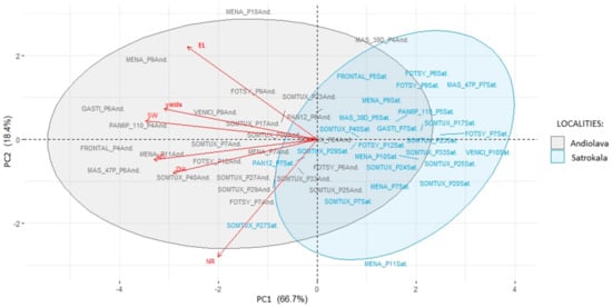 Principal component graph of the half-sib progeny vegetative and productive traits in the two localities. And. = Andiolava; Sat. = Satrokala; NR = number of rank/ear; DIA = ear diameter; NS = number of seed/ear; SW = seed weight/ear; EL = ear length.