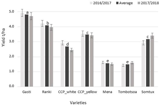 Concerning the two years of CCP open field trials performed in Satrokala (AS 2016–2017 and 2017–2018) without fertilization and irrigation, the soil condition (block factor) and cultivation years did not significantly affect the varieties’ productivity (F = 52.8; p > 0.05 and F = 68; p > 0.05 respectively). The yields significantly varied according to their different accessions (F = 35; p < 0.05). Hybrids exhibited the best performances in both years, with Gasti producing 4.8 t/ha and Ranki 4.1 t/ha (Figure 4). The yellow CCP population’s yield was significantly lower than the hybrid productions’ yield but did not differ from that of the Somtux populations and was significantly higher than the landrace yields. The white CCP population produced more than the local landraces but less than the other populations and the hybrid varieties.