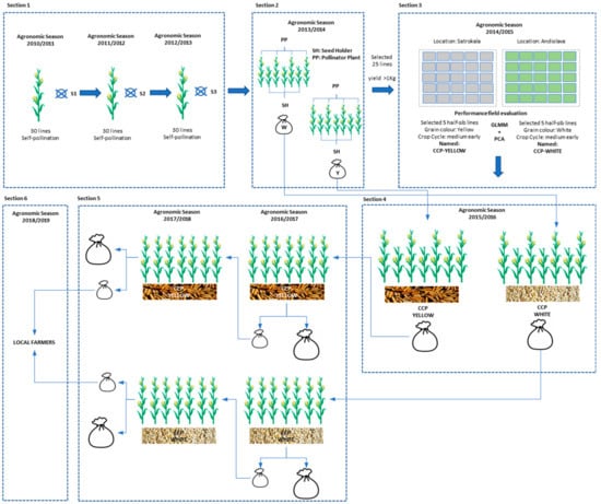 Thirty inbred lines (Table 1) were selected and reproduced from different maize accessions, starting from the AS of 2010–2011 (Scheme 1, Section 1). Of these entries, 10 lines came from an improved composite population selected in Somalia (Somtux) in the 1980s [], 10 came from commercial hybrids, and 10 came from local Malagasy germplasm. The starting hybrid varieties and local landraces were chosen according to their commercial availability in the Malagasy market, while the Somtux population was considered for their good agronomic performance in tropical environments []. The selected inbred lines were characterized by different kernel colors (Table 1) and by a good uniformity in their different phenological developmental stages, assessed with the BBCH (Biologische Bundesanstalt, Bundessortenamt und Chemische Industrie) protocol following Meier [].
