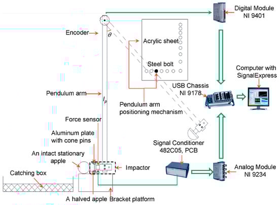 In past studies [27,28] on fruit-to-fruit impact, researchers generally used two pendulums formed by thin nylon threads to support a pair of apples that can be released from a certain angle to freely impact each other. With this technique, it was difficult to precisely control the specific impact location on the fruit surface. To address this challenge, we designed a special pendulum-type impact testing device (Figure 1) as an improvement over the one used in the past to conduct impact tests between apples and various types of catching surface materials [15]. The test device used in this work was designed in a modular fashion to minimize potential errors/noises. The device primarily consisted of a pendulum arm, an incremental rotary encoder, a set of arm positioning mechanism, an impactor and an aluminum structural frame. The pendulum arm was a 0.9 m long aluminum tube with a 19 × 19 mm cross section. The rotary encoder (E6B2-CWZ3E, YUMO, Yueqing, China) installed at the pivot of the pendulum arm was utilized to measure the angle of swing. The pivot was supported by a pair of ball bearings to reduce the friction. The positioning mechanism included a pair of acrylic sheets (30 cm × 15 cm) with a series of 15 positioning holes at 5° increments, which was used to set the initial position of the pendulum arm. The impactor was attached to a force senor (PCB Piezotronics 208C02, sensitivity: 11.24 mV/N; measurement range: ± 445 N), a rectangular steel tube, and a square aluminum plate (5 cm length × 5 cm width × 0.64 cm thickness) with four pins (2 cm length × 2.8 cm interval). With this mechanism, the impacts between test objects (apples in this case) occurred at the lowest point of swing and in a horizontal direction. Since the impact time was very short (about 5 ms), the friction involved was ignored. Impact force was assumed to be the same as it was applied to the stationary apple. Impact forces and angles of swing were acquired by National Instruments (NI) cards with a sampling frequency of 25.6 kHz and 62.5 Hz, respectively, and were processed using NI Signal Express, 2014.