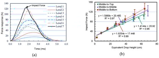 (a) Typical force response-time curves for different impact levels in the same impact zone (middle-to-middle); the greater the impact level, the higher the impact energy it exerted. (b) The linear regression equations between equivalent drop height and impact force for the three impact zones.