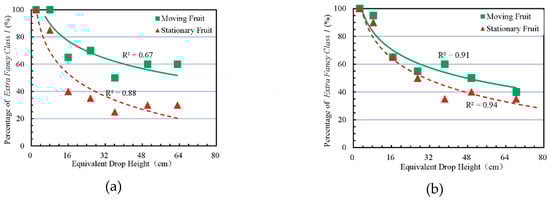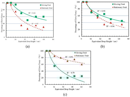 Percentages of Extra Fancy Class 1 grade fruit with increasing equivalent drop height for free apple-to-apple impact in (a) middle-to-top, (b) middle-to-middle, and (c) middle-to-bottom impact patterns. Logarithmic curves were fitted separately for stationary and moving fruit samples.