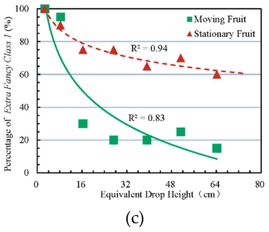The percentages of both Extra Fancy Class 1 grade fruit and Extra Fancy grade at each impact level were calculated using Equation (4). These measures were calculated separately for stationary fruits and moving fruit involved in the apple-to-apple impact. Past studies have shown that fruit impact-induced bruising is dependent upon fruit weight [39] and drop height [22]. In this study, the fruit weight had no significant influence on impact force at a significant level of 0.05, primarily because this fruit weight itself was mostly uniform (statistically). The fruit bruising severity was, therefore, primarily determined by the equivalent drop height of the fruit, which was confirmed by a multiple stepwise linear regression.