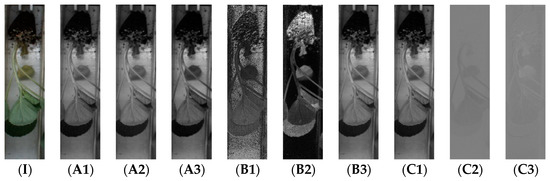 Experimental pictures in different color spaces. (I) the original image; (A1–A3) the R, G, and B channel images in the RGB color space; (B1–B3) the H, S, and V channel images in the HSV color space; (C1–C3) the Y, I, and Q channel images in the YIQ color space.