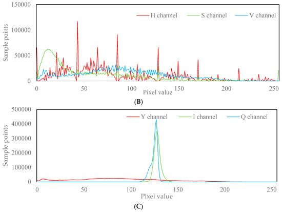 The implementation of the threshold segmentation algorithm depends on the appropriate color space. In this article, a grayscale histogram was used to determine the color space. Image color spaces include RGB, HSV, YIQ, etc. (see Figure 2). The color histogram peak feature analysis method was used to determine the image segmentation color space: Ten images of cabbage seedlings were randomly selected and converted into the RGB, HSV, and YIQ spaces respectively. Then, each color space gray histogram was accumulated (see Figure 3). As is shown in Figure 2(A1–A3) and Figure 3A, three channels of the RGB space showed peak characteristics, wherein the green channel peak characteristics of the G green channel were the most stable and the peak region corresponded to the substrate region. As is shown in Figure 2(B1–B3) and Figure 3B, among the three channels of the HSV space, the S channel showed peak characteristics, but the peak area corresponded to the background area. As is shown in Figure 2(C1–C3) and Figure 3C, neither of the three channels in the YIQ space showed a peak corresponding to the substrate region. Therefore, the RGB space G channel was selected as the color space for substrate segmentation.