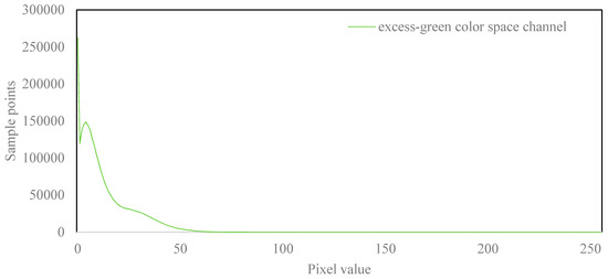 The excess green color space (see Equation (1)) is commonly used in green target segmentation. The color component of the seedling area in the sample image was significantly higher than other areas (see Figure 4 and Figure 5), and the threshold segmentation method could realize the segmentation of seedling regions. Therefore, the excess green color space was used to segment the seedling area.