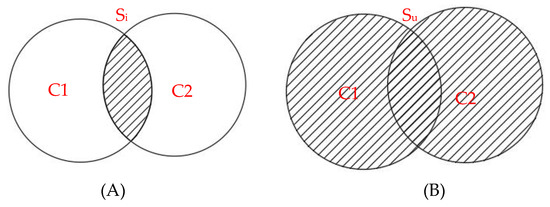 C1 is the artificial labeled image segmentation result, which is called the ground truth. C2 is the image segmentation result by the algorithm. Si is the shadow in Figure 6A, which is the intersection of C1 and C2. Su is the shadow in Figure 6B, which is the union of C1 and C2.