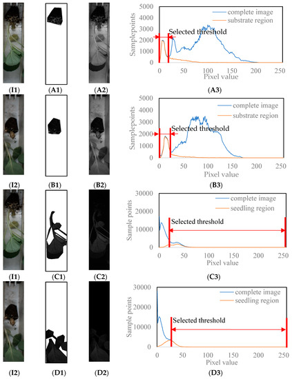 The original images and the artificially labeled substrate area and seedling area images are shown in Figure 7 and the corresponding G channel, and excess green color space gray histogram are shown in Figure 8. As is shown in Figure 8(A3,B3), the gray histogram of the artificially labeled substrate region had a peak coincidence with the gray histogram of the complete image in the G channel, and the overlap interval was [0, selected threshold]. Therefore, it was feasible to use the threshold segmentation method to achieve the segmentation of the substrate region and the background region. As is shown in Figure 8(C3,D3), the grayscale histogram of the artificially labeled seedling region had a higher degree of coincidence with the higher color component of the grayscale histogram of the complete image. Therefore, it was feasible to use the threshold segmentation method to realize the segmentation of the seedling area and background area.