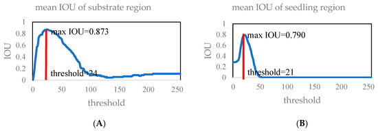 In this section, the optimal threshold for matrix and seedling region segmentation is obtained by experimental methods. From the dataset consisting of 500 images, 10 images were randomly selected as Training Set 1, and the image segmentation threshold was calculated using the maxIOU method. The experiment result is shown in Figure 11A,B: The maximum IOU of the substrate region was 0.873, and the corresponding segmentation threshold was 24. The maximum IOU of the seedling region was 0.790, and the corresponding segmentation threshold was 21. Combined with the analysis in Section 2.4 (see Figure 7 and Figure 8), the color component interval corresponding to the segmented substrate region was [0, 24] in the G channel, and the color component interval corresponding to the segmented seedling region was [21, 255] in the excess green color space.