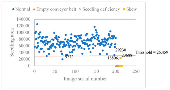 According to Equation (7), a scatter plot was used to determine the lower threshold of seedling area (see Figure 13). According to the defect feature analysis in Table 2, the empty belt, lack of seedlings, and skewed seedling images were selected for comparison with the normal group images. The area minimum of the normal group seedlings was 19,275 pixels, followed by 29,230 pixels. The area maximum of the empty belt, lack of seedlings, and skewed seedling was 23,688, followed by 18,806. The classification results of different segmentation thresholds are shown in Table 3. As shown in Table 3, when the classification threshold interval was (18,806, 19,275), there was one misclassification in the empty conveyor belt images, while the seedling deficiency, skew, and normal images were all classified correctly. When the classification threshold interval was (19,275, 23,688), there was one error respectively in the normal images and the defect images’ (empty conveyor belt, seedling deficiency, and skew images) classification result. When the classification threshold interval was (23,688, 29,230), there was one misidentification in normal images’ classification, and the defect images (empty conveyor belt, seedling deficiency, and skew images) were all classified correctly. As the effect of defect seedling misidentification was greater than normal seedling misidentification, the seedling defect identification threshold interval should be selected as (23,688, 29,230). Finally, the threshold was taken as the intermediate value of 26,459 in the experiment.