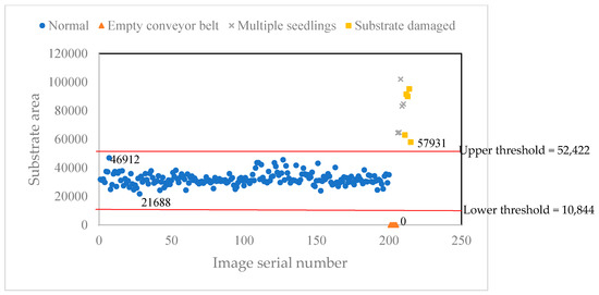 According to Equation (7), a scatter plot was used to determine the upper and lower threshold of the seedling area (see Figure 14). According to the defect feature analysis in Table 2, the empty conveyor belt, multiple seedlings, and substrate damaged images were selected for comparison with the normal images. The area maximum of the normal group substrate was 46,912 pixels, and the area minimum of the normal group substrate was 21,888 pixels. The area maximum of the multiple seedlings and substrate damaged images was 51,931 pixels. All the area of the empty conveyor belt images was zero. There was no overlapping interval between the normal group and the defect images. The substrate identification lower threshold interval was selected as (0, 21,688), and the upper threshold interval was selected as (46,912, 57,931). Finally, the lower and upper threshold were taken as the intermediate values of 10,844 and 52,422 in the experiment.
