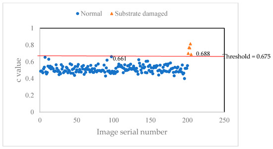 According to Equation (9), a scatter plot was used to determine the threshold of the c value of the substrate’s lower part (see Figure 15). The c value maximum of the normal group images was 0.661, and the c value minimum of the substrate damaged images was 0.688. There was no overlapping interval between the normal group and the substrate damaged images. The c value threshold interval was selected as (0.661, 0.688). Finally, the c value threshold was taken as the intermediate value of 0.675 in the experiment.