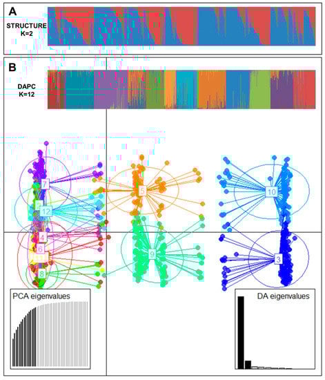 The number of detected clusters was 12 in concordance with the lowest BIC value obtained using the find.clusters function. DAPC analysis was carried out using the detected number of clusters (Figure 1B). Fifteen first PCs (90.9% of variance conserved) of PCA and three discriminant eigenvalues were retained. These values were confirmed by cross-validation analysis.