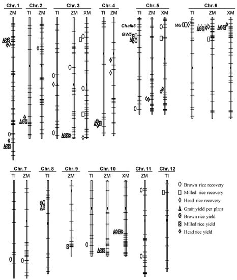 In the past two decades, analysis of quantitative trait loci (QTLs) was employed to study the genetic basis of rice milling quality. A larger number of QTLs were identified using various populations developed from crosses of the same subspecies [3,9], between the indica and japonica subspecies [6,10,11,12], or between different species [2]. In these studies, clustering of QTLs for different milling traits was commonly observed. Some of them detected only one cluster. For example, Tan et al. [9] located QTLs for MR and HR in the C1087–RZ403 region on chromosome 3; Aluko et al. [2] detected br8 and hr8 in RM126–RM137 on chromosome 8; and Lou et al. [12] found qMRR-3 and qHRR-3 in RM3204–RM6283 on chromosome 3. Other studies detected more clusters. Li et al. [6] located qBR-4 and qMR-4 in the C975–C734 interval on chromosome 4, qBR-9 and qMR-9 in R1751–R2272 on chromosome 9, qBR-10 and qMR-10 in C488–R716 on chromosome 10, and qBR11 and qMR11 in R728–G202 on chromosome 11. Zheng et al. [11] detected QBr6 and QMr6 in the Wx region on chromosome 6, and QBr7 and QMr7 in RM505–RM118 on chromosome 7.