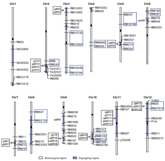 In the other five regions, one QTL was detected in each region. Included were qBR3.2 located in the interval RM16048–RM16184 on chromosome 3, qBR5.2 in RM274–RM334 on chromosome 5, qBR7 in RM70–RM18 on chromosome 7, qBR10 in RM6100–RM3773 on chromosome 10, and qMR12 in RM20–RM27610 on chromosome 12.