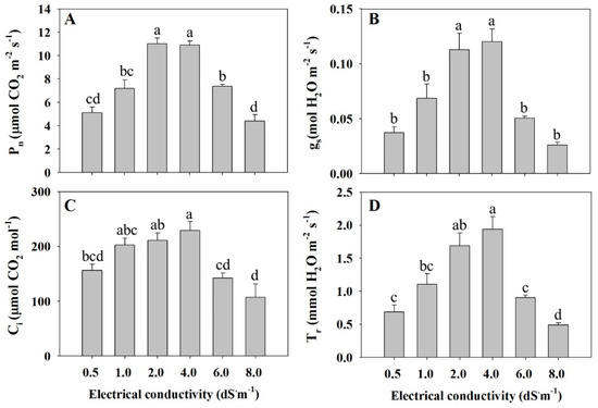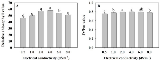 - EC8.0 dS·m−1: diluted Hoagland nutrient solutions A (1000 mL) and B (1000 mL) in 50 liters deionized water.