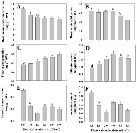 | ECw (dS·m−1) | RA Concentration in Plant Organs (mg g−1 DW) | Tilianin Concentration in Plant Organs (mg g−1 DW) | Acacetin Concentration in Plant Organs (mg g−1 DW) | |||||||||