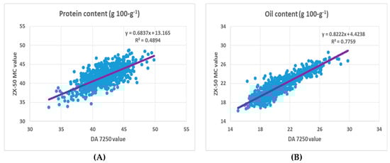 Correlation between near-infrared (NIR) analysis methods DA 7250 and ZX-50 MC in predicting soybean seed protein (A) and oil (B) content.