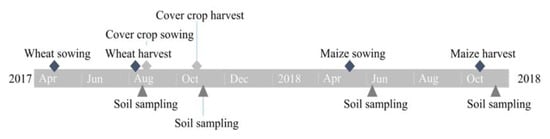 General timeline of sowing and harvesting of various crops and soil sampling throughout the experiment.