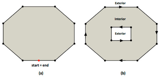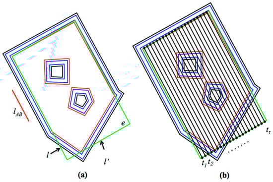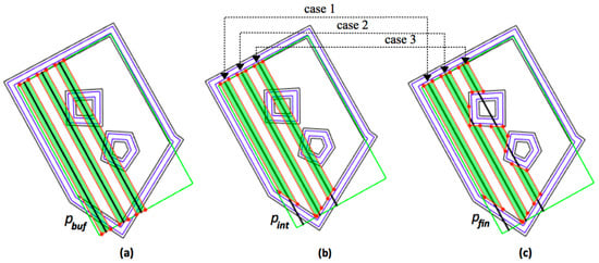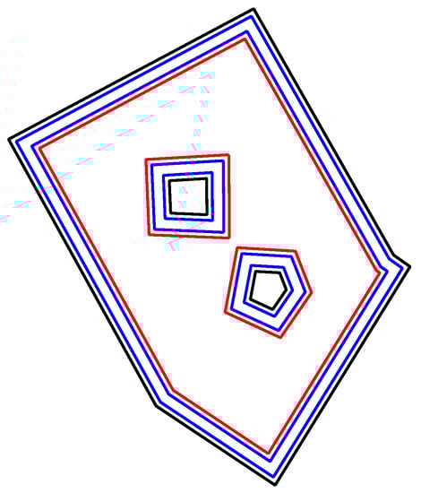 - Next, the boolean intersect operator is applied to check whether the intersects with the obstacles. Following this, there are three potential cases, as illustrated in Figure 8c: Case 1: if is not intersected with any obstacle, then remains unchanged; Case 2: if only partially intersects with obstacles, then the subtraction operator is employed to obtain the subtracted area; and Case 3: if crosses through an obstacle, then the subtraction operator divides the polygon into sub-polygons. Other cases such as a partially intersects one obstacle and crosses through another obstacle are considered as the case of the combination of basic cases 2 and 3.