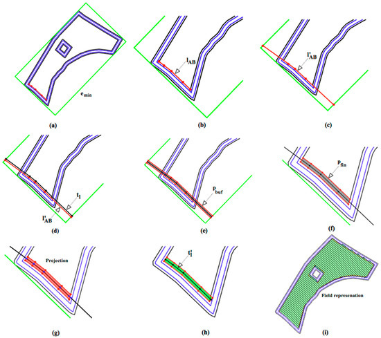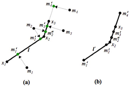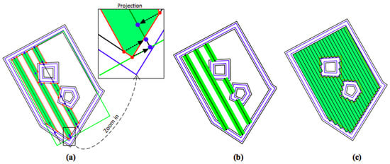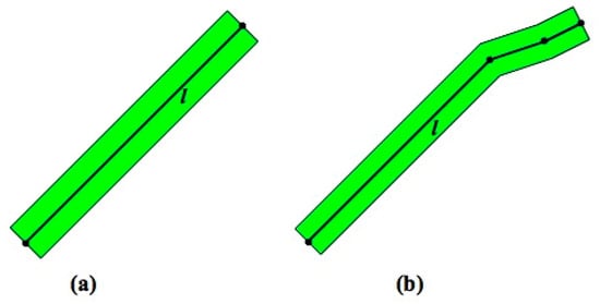 - After the subtraction operation has been performed, each area is enclosed by a ring with multiple points denoted as a set (red points in Figure 8c). To obtain the final track, , first, points in the set are projected to the initial track by the projection operator to acquire the projection points set . Afterwards, the final track (black dotted lines in Figure 9a) is created using the union operator . In addition, the row of the final track (green area in Figure 9b) is generated by employing the buffer operator .