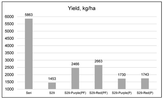 In 2018, experimental lines along with S29 and Seri were tested in Konya, Turkey on large plots (40 m2) under irrigated conditions. S29 and all isogenic lines were lodged resulting in relatively low yield compared to Seri, which by far out yielded all other lines (Figure 1). Both isogenic lines S29-Purple(PF) and S29-Red(PF) had yields almost twice as high as the recurrent parent and 40–45% higher than lines originating from Purple.
