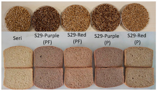 The 2018 experiment provided sufficient grain for more detailed evaluation of compositional, physical, and technological properties (Table 6). The large differences in adaptation, grain yield, and quality of Seri and experimental lines were reflected in significant variation for a number of traits and parameters. For the test weight, 1000-kernel weight, protein content, and Zeleny sedimentation, Seri was significantly higher than S29 and isogenic lines, which did not differ among themselves. The slight superiority of purple-grained lines in 1000-kernel weight compared to red grain isolines, which was observed in 2017, was not confirmed in 2018. The darker color of purple-grained lines was detected using the colorimeter (L, a and b) on intact grain, whole wheat flour and bread crust and crumb (Figure 2). All the products from purple-grained lines had darker color judged by the L value. The total dietary fiber content in whole wheat flour and bread was highest in two isogenic lines derived from Purple, followed by those derived from Purple Feed and Seri. Both whole wheat flour and bread from purple-grained lines had higher total phenolic content, although the difference was significant only for S29-Purple(PF) vs. S29-Red(PF) for bread. However, Seri had the highest total phenolic content, which was significant. Variety Seri, being a semi-dwarf, is totally different in adaptation and quality from the old and tall material based on S29. It shows once again the importance of the comparison of related germplasm to single out the gene effects. There were no statistically significant differences in antioxidant activities in flour and bread. The rheological dough parameters (development time, BEM torque, and several others not presented in the table) of purple-grained lines were as good as their red counterparts and were, overall, superior to Seri. The baked bread volume and specific bread volume of purple-grained lines were not significantly higher than red-grained lines. There was no difference between the lines for sensory parameters such as springiness and cohesiveness.