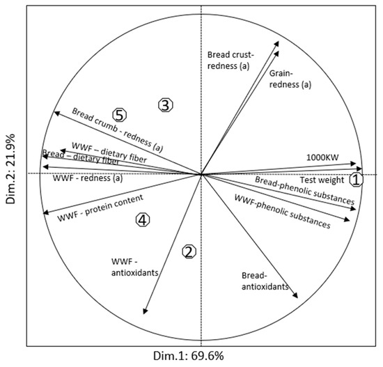 Biplot analysis of grain quality traits, in Konya, Turkey, 2018. (1) Seri, (2) S29-Purple(PF), (3) S29-Red(PF), (4) S29-Purple(P), and (5) S29-Red(P). WWF, whole wheat flour.