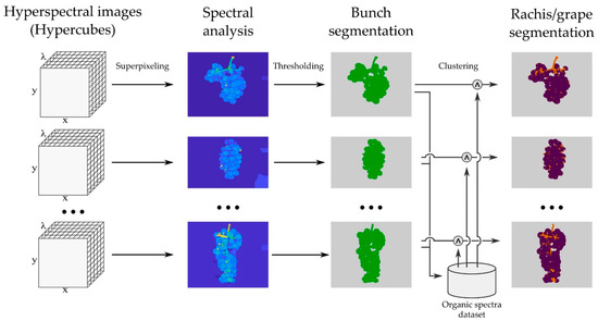 Schematic representation of the image processing segmentation workflow. Hyperspectral cubes were first segmented to obtain the area covered by the bunch, using a superpixeling-based segmentation procedure. The results are represented green on gray. Then, the pixels at all images were globally clustered into two classes (using information from spectral ranges 1295–1311 nm) to discriminate from the rachis and grapes. Such results are shown in purple (grape) and orange (rachis) and gray.