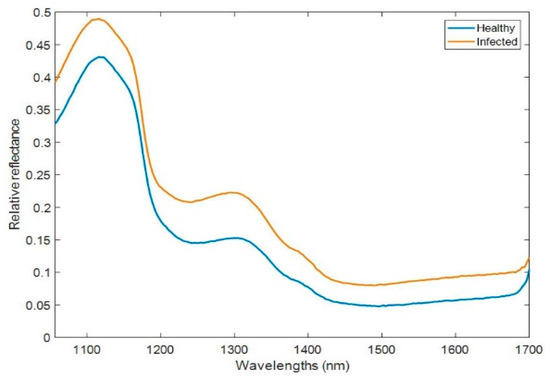 Mean reflectance spectra of the two classes comprising the calibration dataset (healthy and infected).