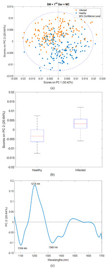PCA results for the calibration dataset using SM + 1st Der + MC pre-processing: (a) score plot of PC1 vs. PC2; (b) boxplot of PC2 scores for healthy vs. infected pixels; and, (c) loadings for PC2.
