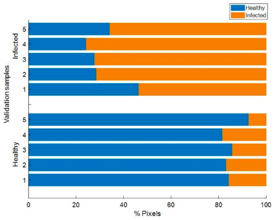 Figure 5 shows the results obtained for the model external validation performed for each sample of the validation dataset (10 bunches) independently. Only the PLS-DA model built using SM + SNV + MC combination was used for the external validation of samples. Figure 5 displays the percentage of pixels classified as either healthy or infected in each validation sample obtained from the probability of each of the pixels belonging to the classes considered.