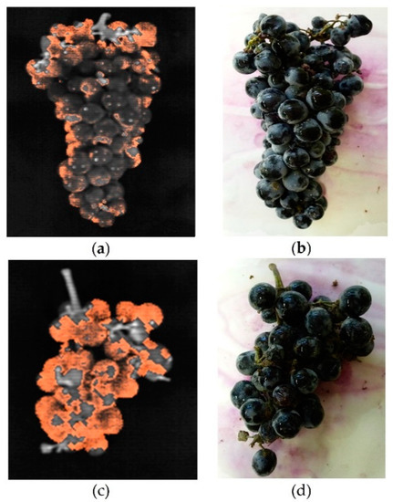 Figure 6 shows a display of the classification of pixels in two bunches (validation sample 1 and 4 of healthy and infected classes, respectively). Images on the left were obtained by the HSI system showing in orange the pixels classified as infected (Figure 6a,c). In the same way, images on the right correspond to the RGB images of the same bunches taken as the reference (Figure 6b,d). For instance, Figure 6a shows a healthy bunch for which 15.71% of pixels were labeled as infected and Figure 6c displays an infected bunch with 75.77% of pixels correctly classified to the class they belonged to. It is important to note the spatial coherence of the classification of pixels in the images. Thus, as seen in Figure 6a, false negative pixels were mostly located on the sloping surfaces of the berries. At the same time, berries illuminated correctly, with a visible surface perpendicular to the HSI system barely presented false negative pixels. This fact suggests that the existence of powdery mildew in the bunch produces a noticeable effect on the spectrum acquired in the berries, which, although can be mistaken with other physical events (lighting, inclination, etc.), makes it clearly distinguishable from non-sick berries.