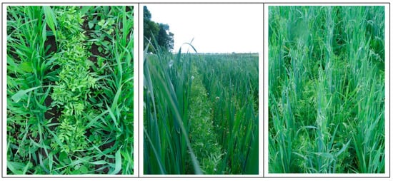 As far as weed infestation reduction is concerned, mixed crops, in comparison to monovarietal crops, have a better adaptive ability as well as making better use of space and habitat resources and, in effect, reducing the pool of these resources for weeds [19]. In agricultural practice, legume–cereal mixtures or cereal mixtures are grown most frequently. Due to the morphological differentiation of individual components, higher weed control ability is attributed to mixtures that include legumes [28,29]. However, Boyd and Brennan [30] drew attention to high weed infestation of legume–cereal mixtures, which are quite frequently grown in organic farms.