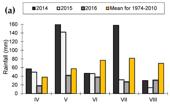 The year 2016, in turn, was the warmest and at the same time driest because in this year the air temperature was higher by about 6 °C compared with 2014 and 2015, whereas the total rainfall was lower by 67% and 45%, respectively. In every month of this year, total rainfall was lower compared with long-term average from 27% (May) to 67% (July).